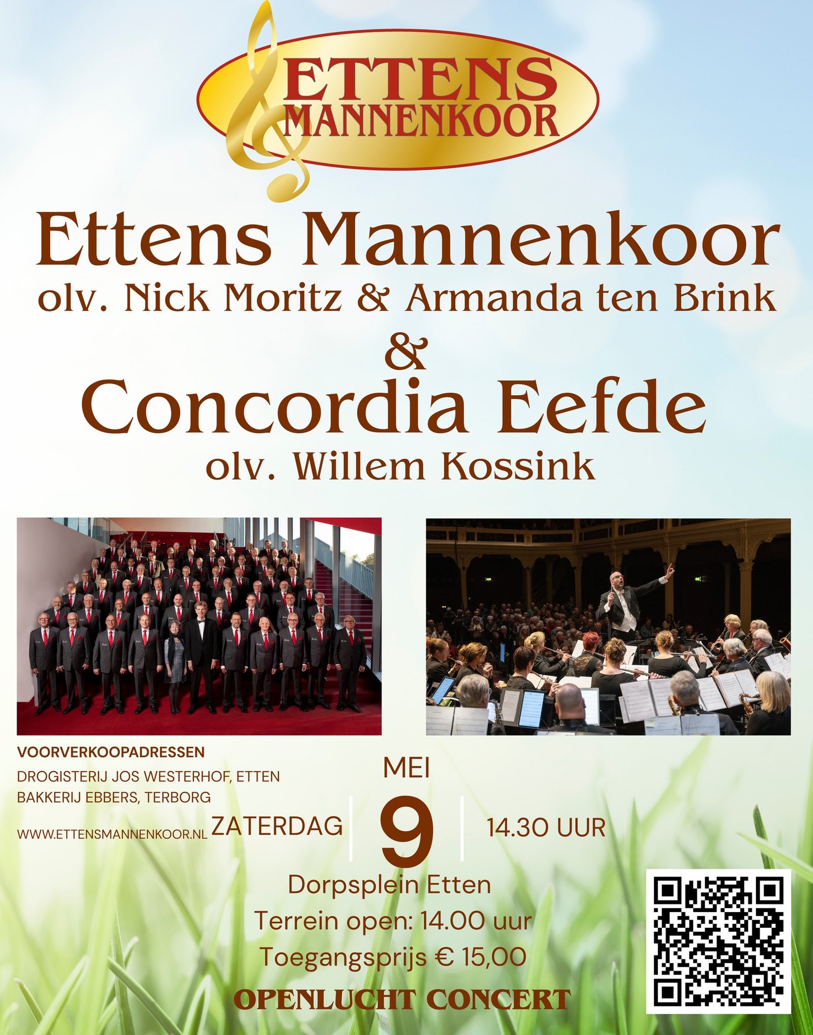 Op het dorpsplein van Etten geeft het Ettens mannenkoor een optreden waarbij Concordia als gast deels begeleidt, maar ook eigen stukken speelt.